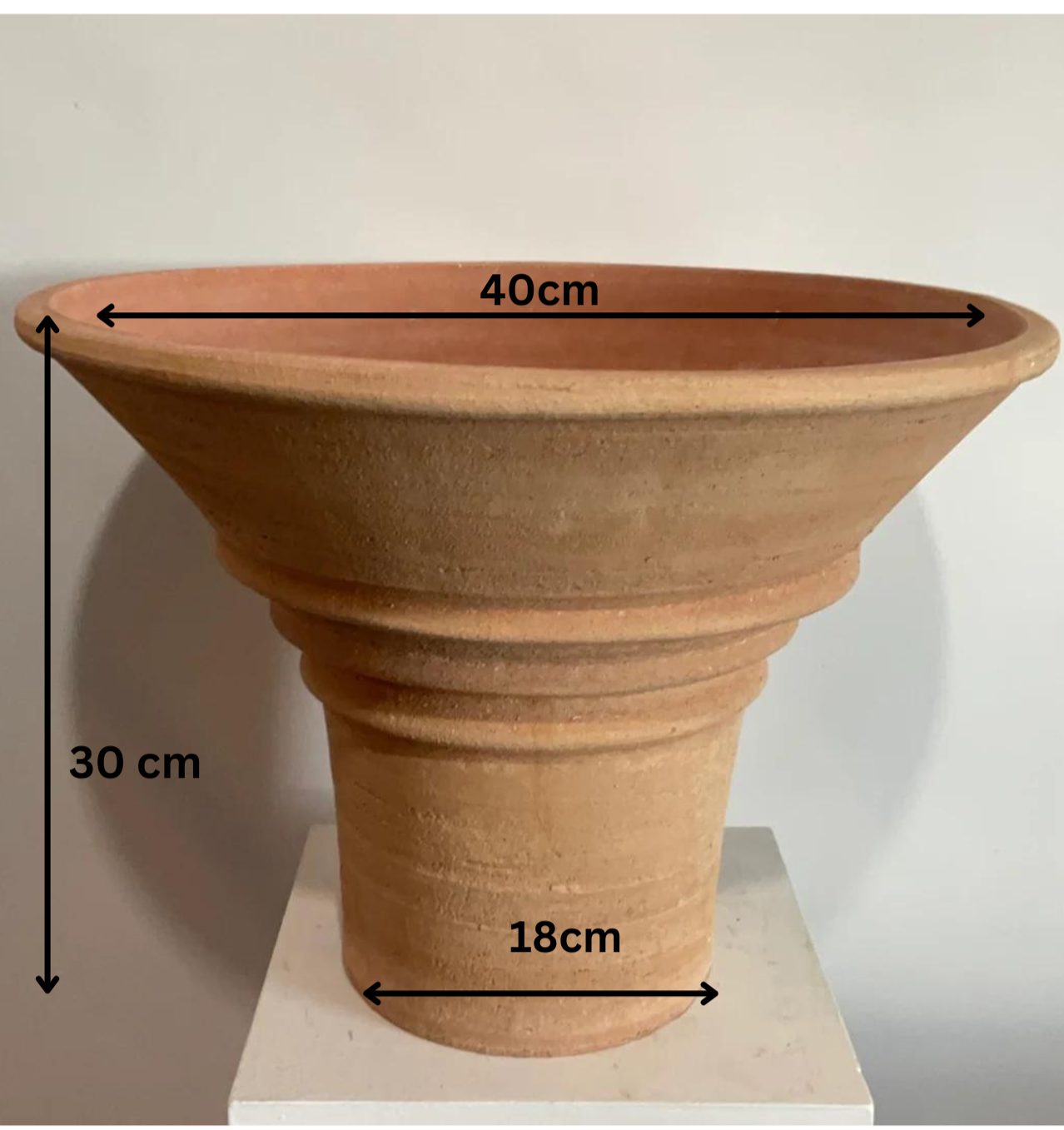 30cm h x 40cm w at widest point 18cm at the base.