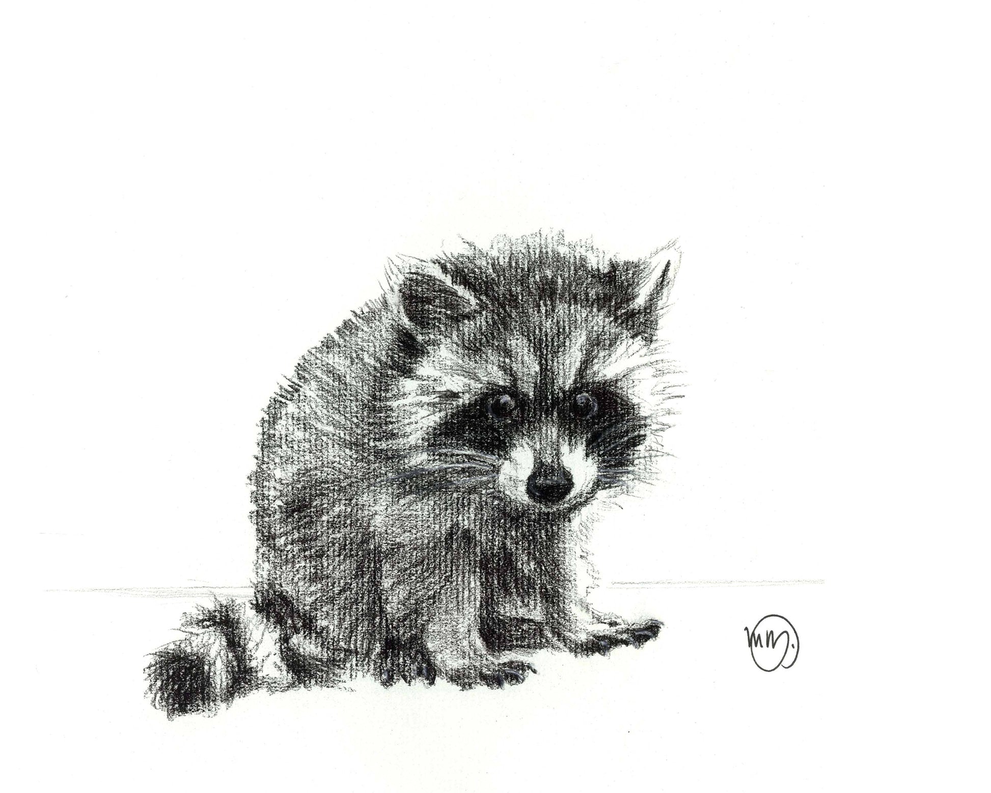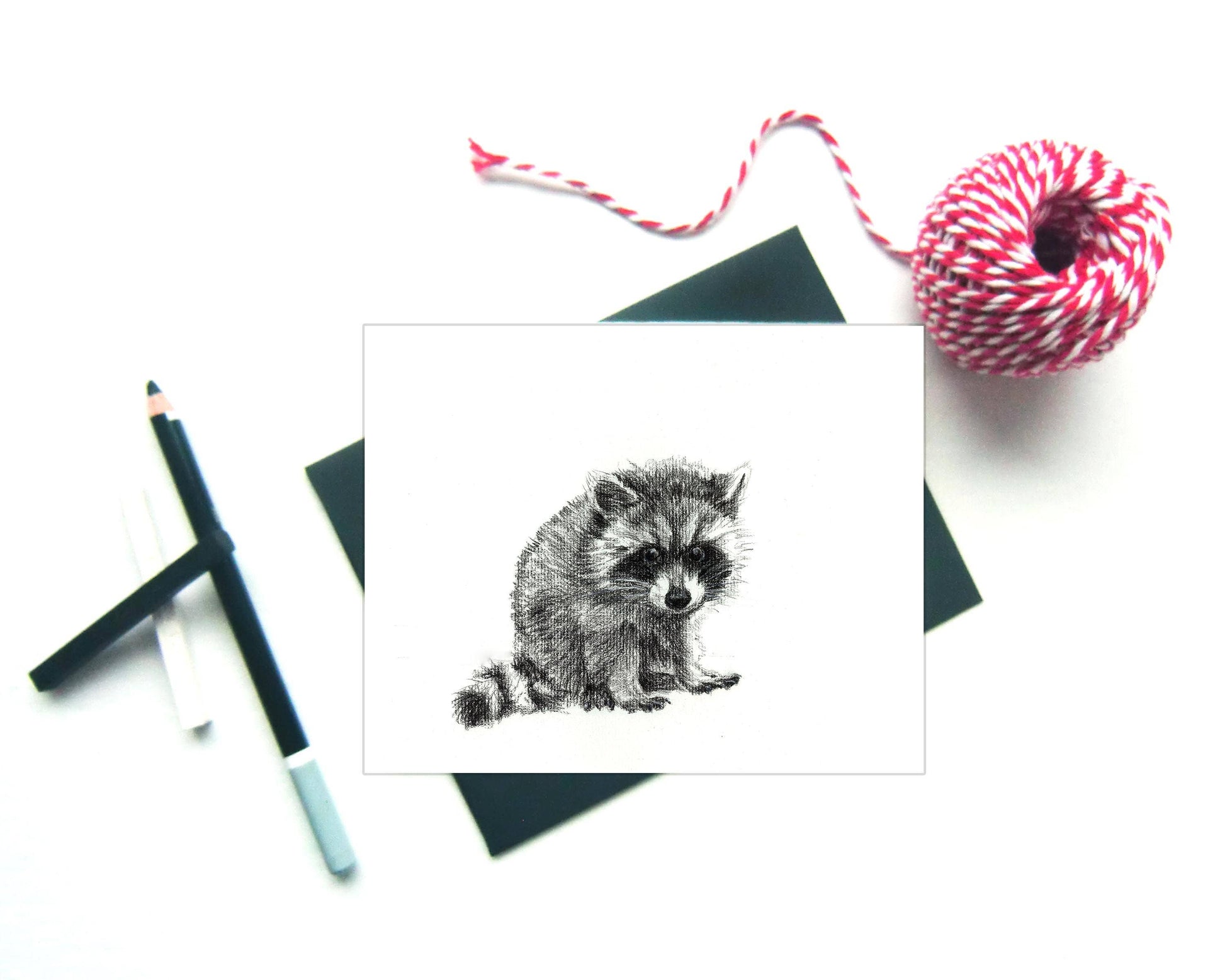Adorable Baby Raccoon Greeting Card, this little love has lost his mother! Needs love and cuddling! Cuteness overload! Brings a comforting presence! Black envelope Inkjet print of the original charcoal drawing **Artistic Quality that permits you to frame it like a print for all kinds of deco projects!! Acid-free paper, FSC certified