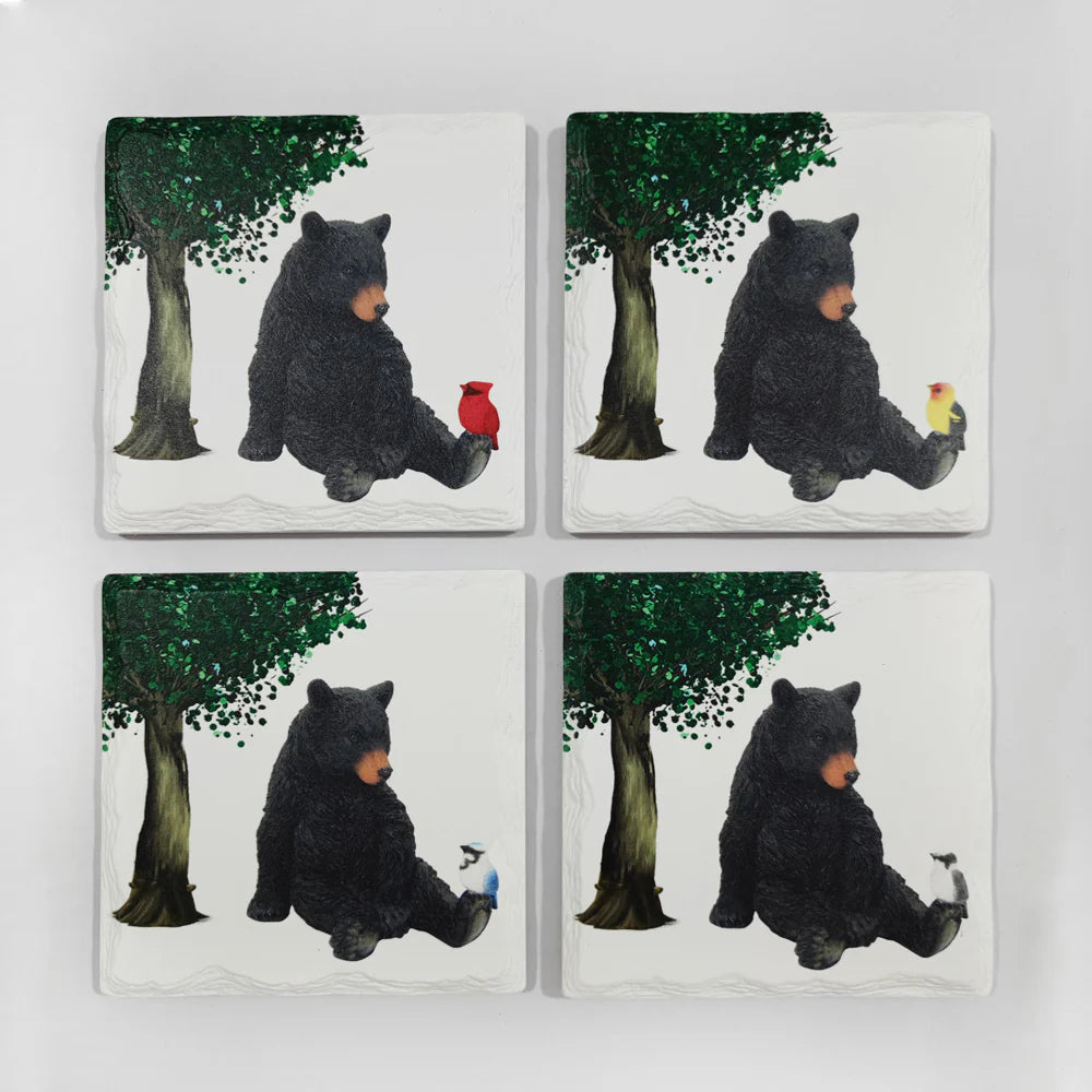 Protect your surfaces in style with these charming Bear and Little Bird Coasters. Featuring a ceramic top adorned with four unique little bird designs and a cork backing to prevent slipping and scratches, they combine functionality with delightful artistry. Perfect for adding a touch of nature-inspired warmth to your home or office while keeping your tables safe from moisture and heat.