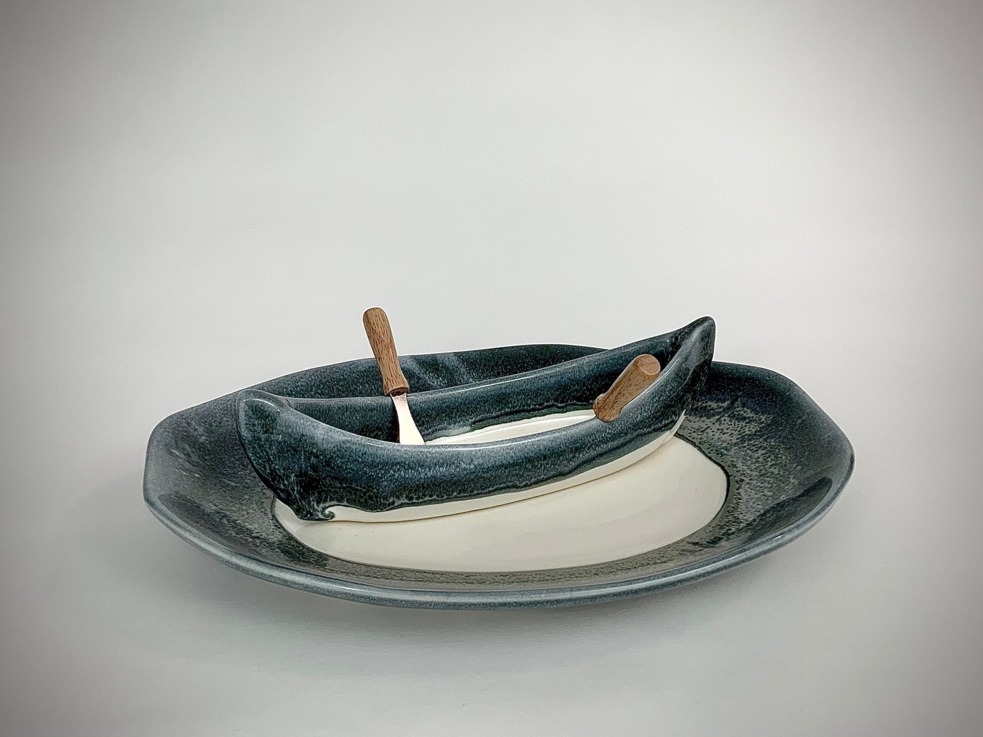 Elevate your entertaining with this charming Canoe on a Lake Dip Set, crafted from Canadian pottery. Perfect for serving dips, chips, veggies, or salsa, it features a pond-shaped base (14" x 10") and a canoe-shaped dip pot (10.25" x 3.25"). Included are two paddles that double as spreaders , making it both functional and conversation-worthy. Bring a touch of rustic elegance to your gatherings with this unique and practical set.