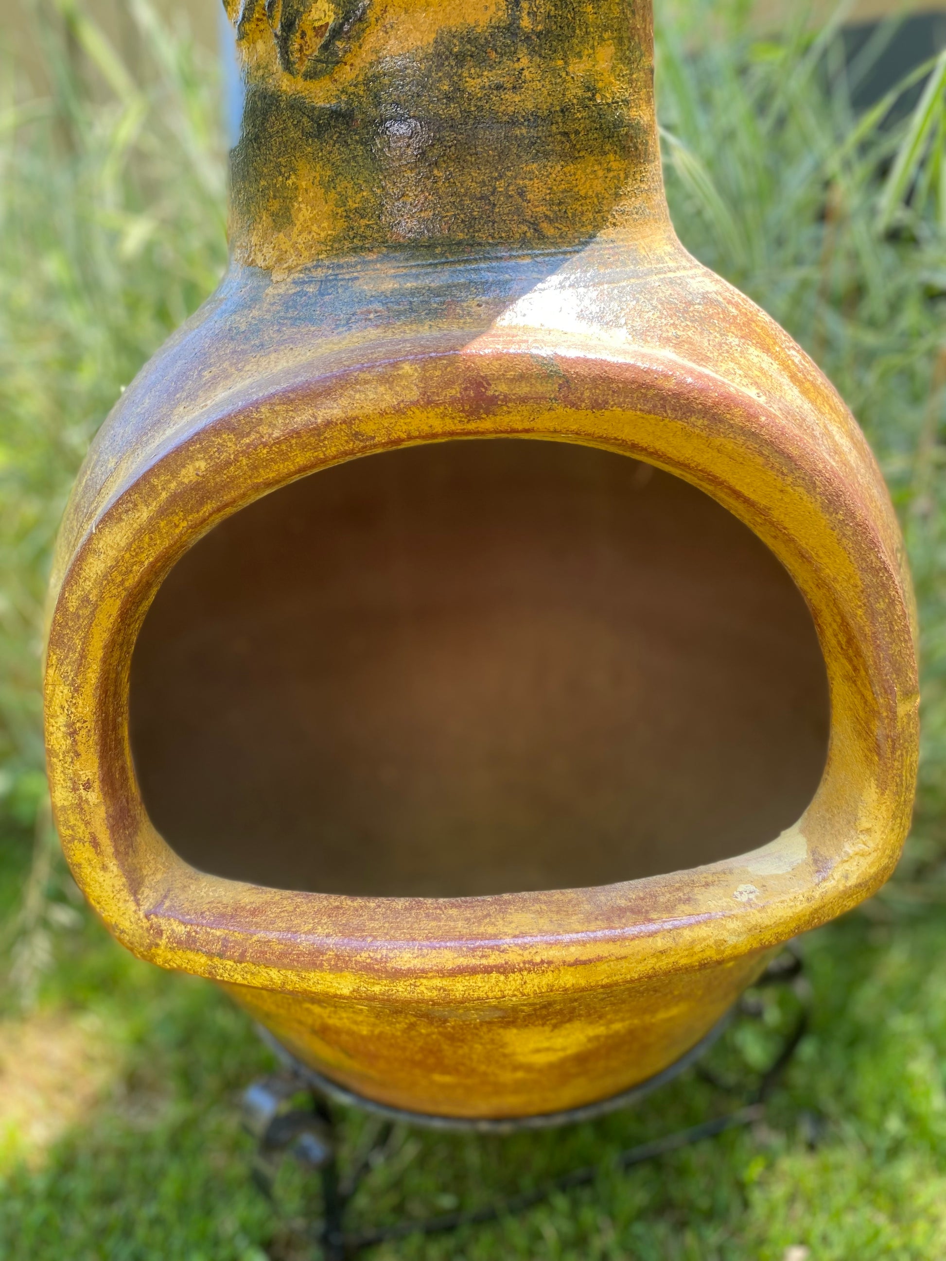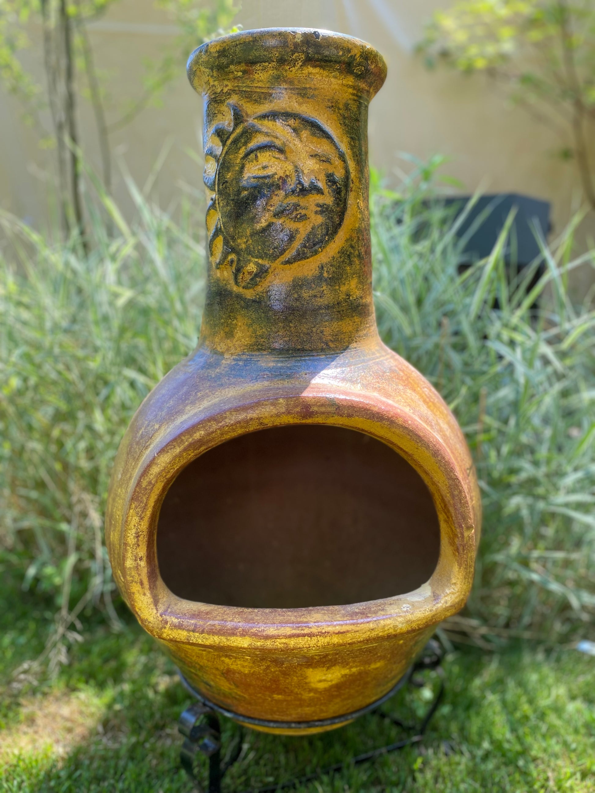 Chimeneas, also spelled chimineas, have been made out of fired clay and used for heating and cooking. These traditional designs can be traced to Spain and its influence on Mexico. The first use of a traditionally designed chiminea appears around 400 years ago.