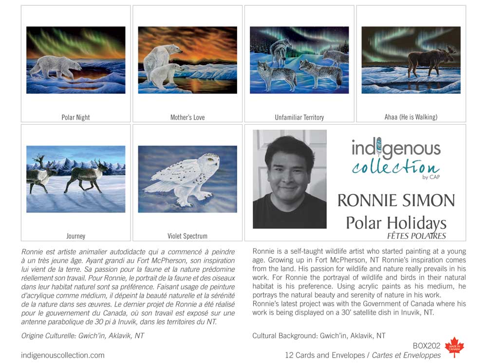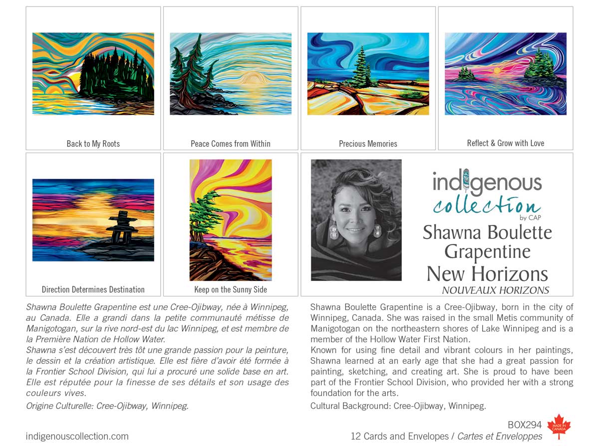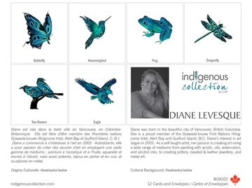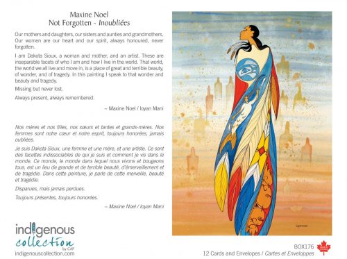 The artist’s biography appears on the back of the box. 12 – 4 x 6 note cards with envelope, 6 designs/2 of each, are packaged in a clear box. Box note cards are labelled Made in Canada.