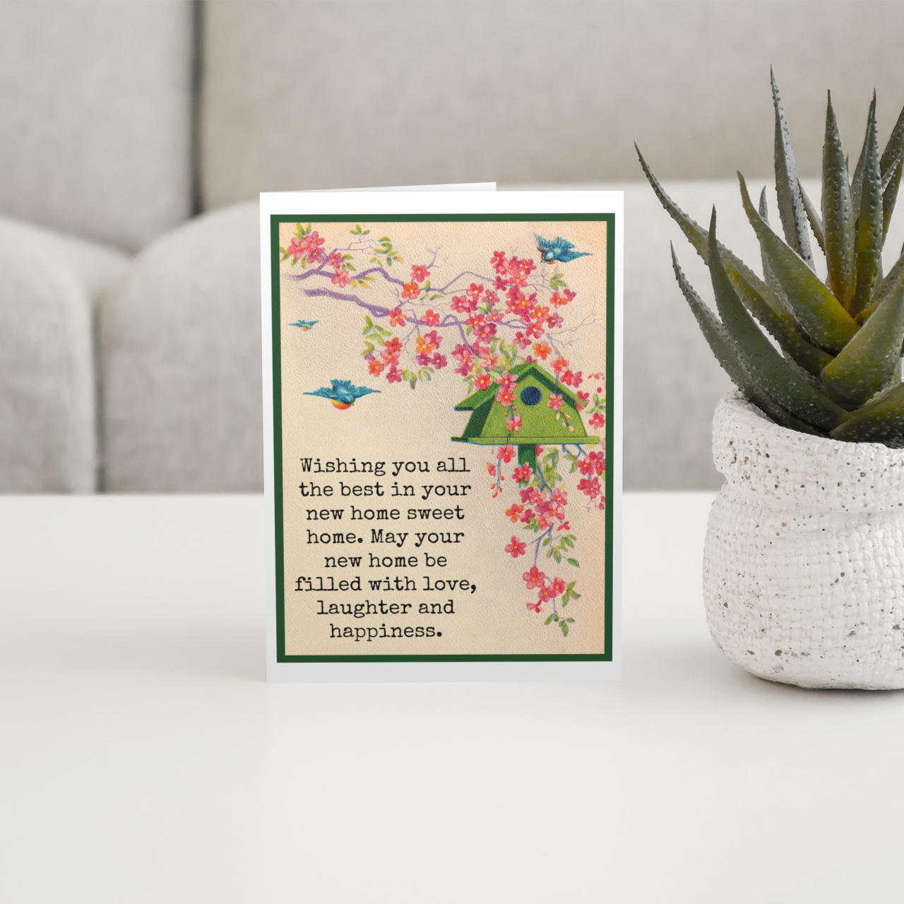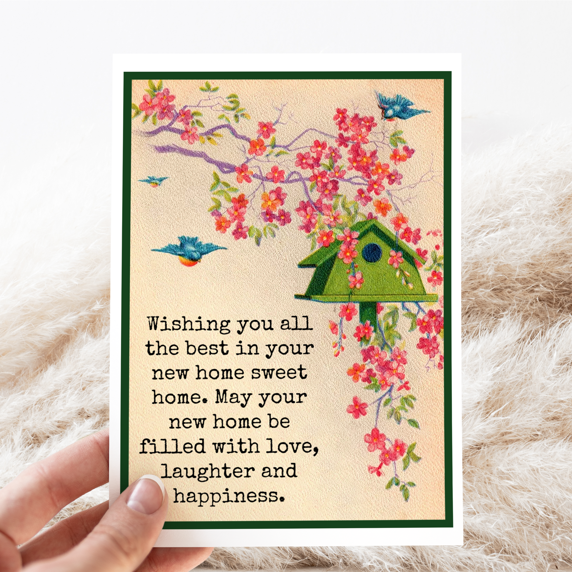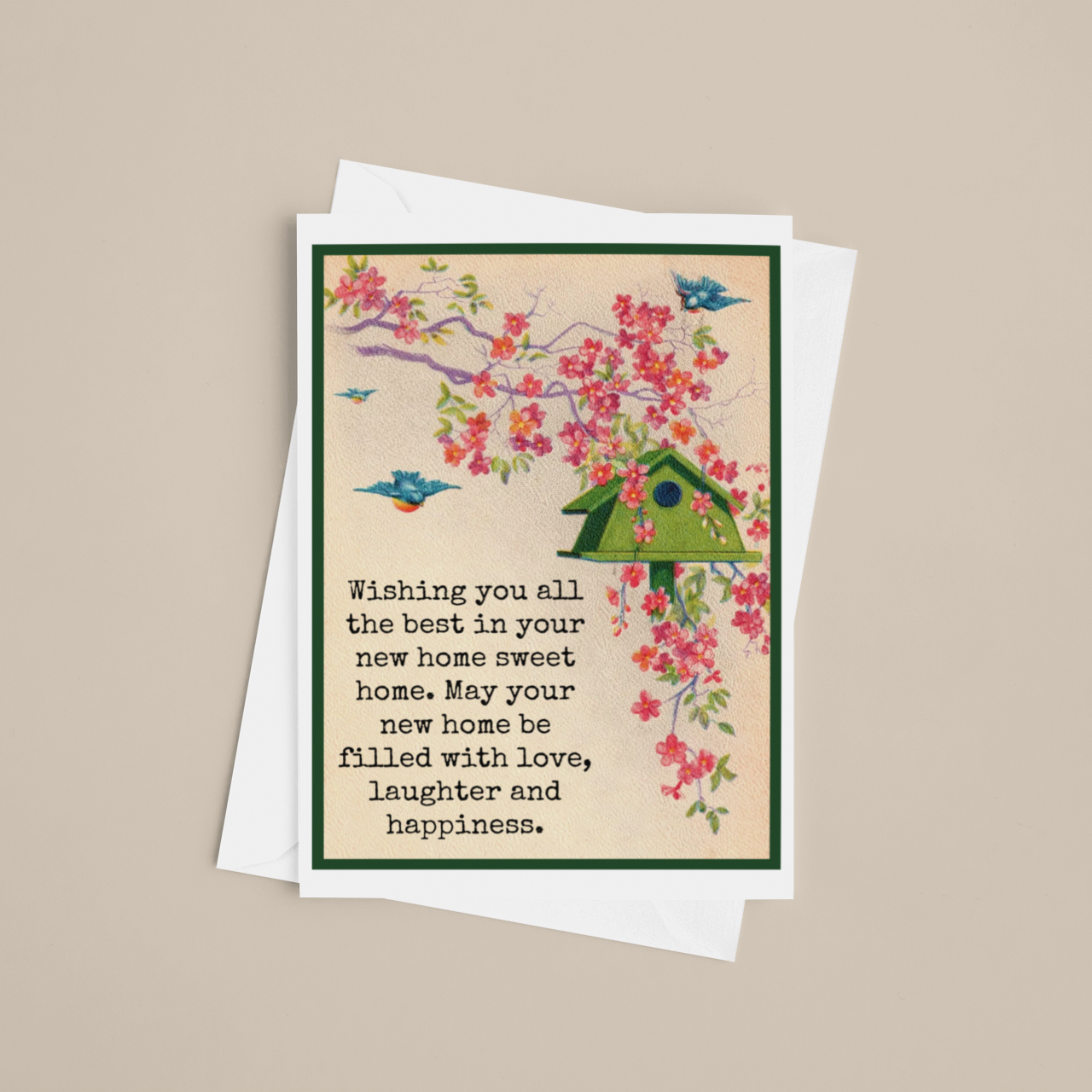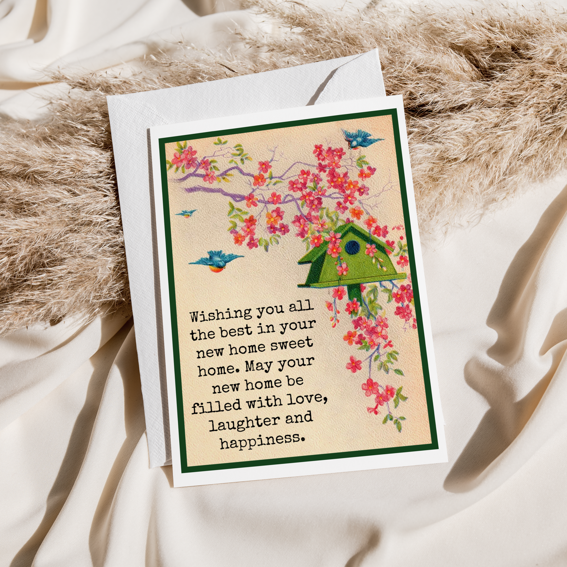 Welcome someone special to their new home with this delightful vintage-inspired greeting card! Featuring a bright, charming card design, this card is the perfect way to share your congratulations and warm wishes as they begin a new chapter.