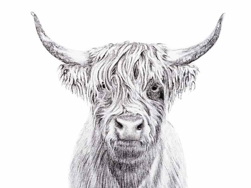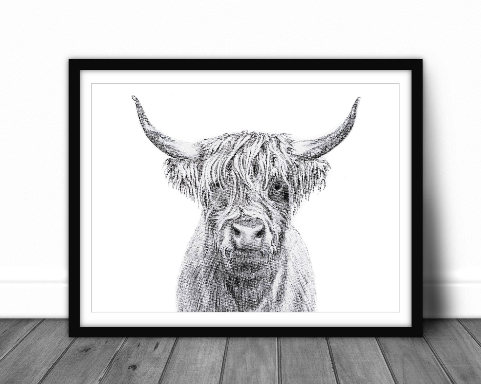 From the eclectic portrait collection: the beautiful highland cow print: this animal art brings a comforting presence into your home. As a living room or bedroom wall decor, it will certainly watch over you! Add zest into your nest! Adopt a highland cow! • black and white. • inkjet print of original charcoal drawing signed by the artist. • high quality textured paper, archival type, acid-free, fsc certified, 215g/m2.