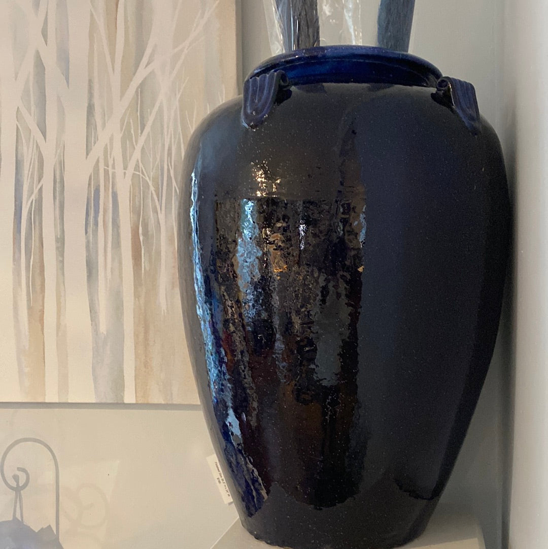 This jar has handles/lugs and has a slight taper to its base. The jar makes a great statement piece either on its own or in a cluster with other glazed pots. Can also be converted into a Water Feature.