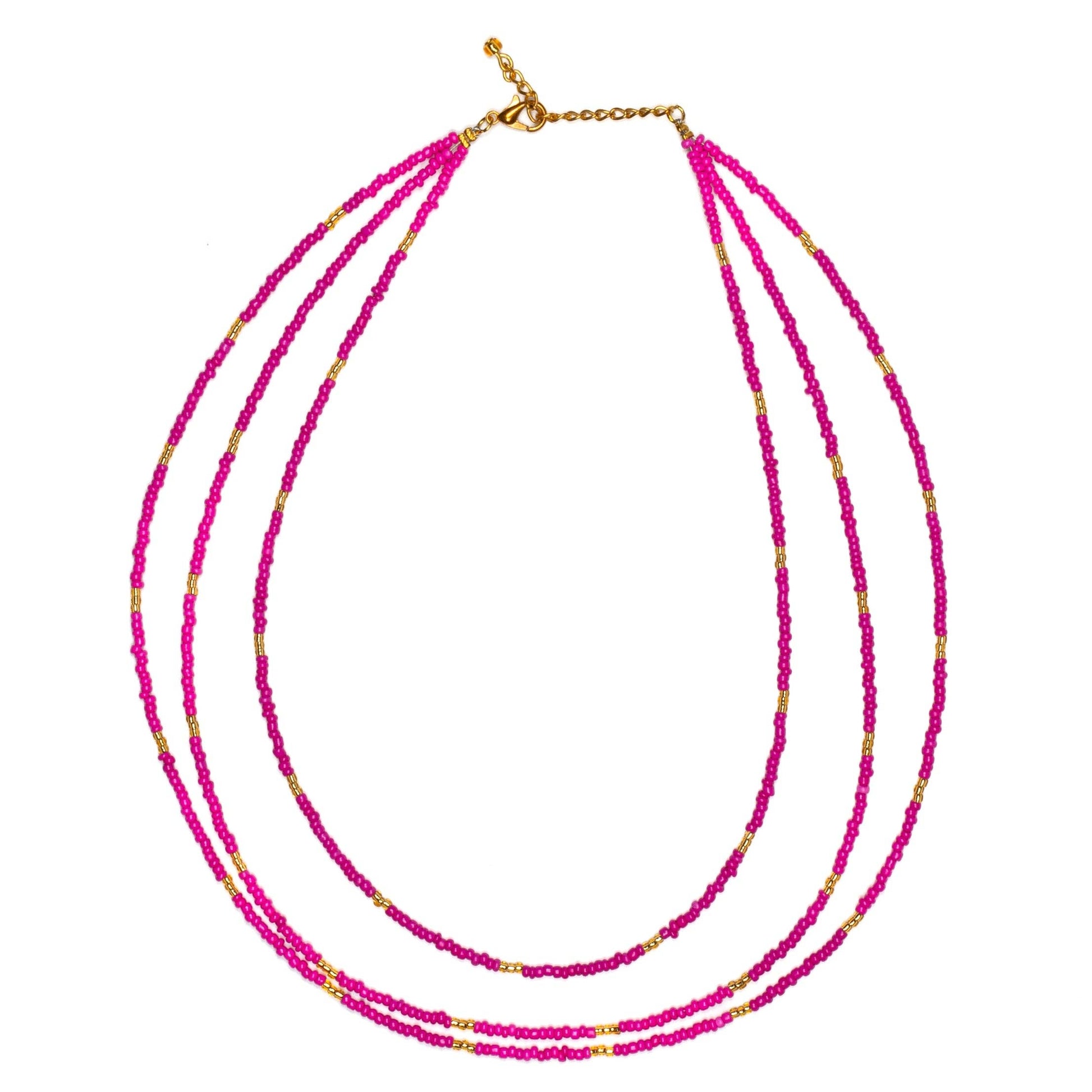 Introducing our Triple Strand Seed Bead Necklace with Gold Accents. This stylish accessory is the perfect addition to any outfit, adding a touch of elegance and sophistication. With its triple strand design and gold accents, it will elevate any look and make you stand out from the crowd. Perfect for both casual and formal occasions, this necklace is a must-have for any fashion-forward individual.