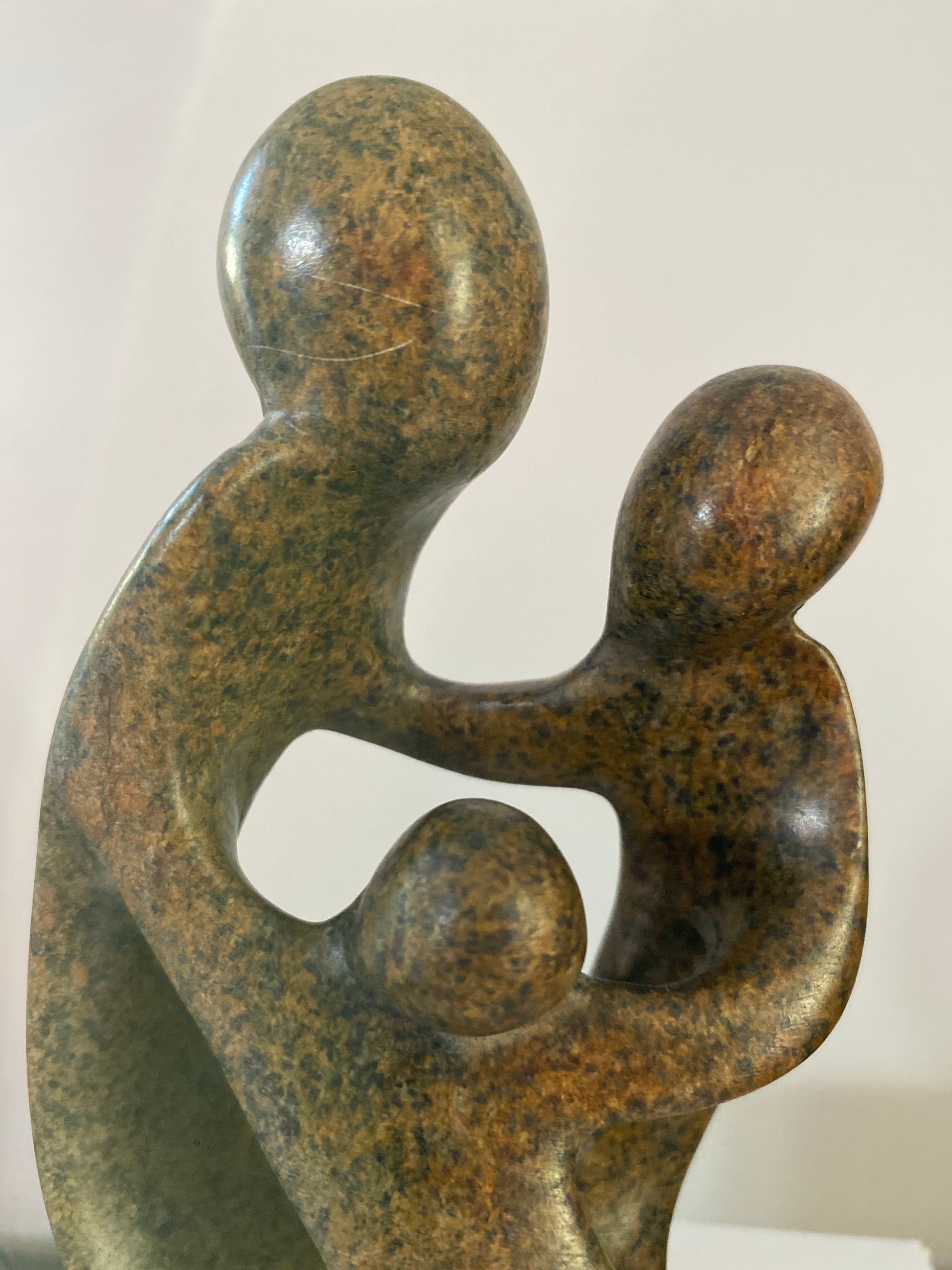 ”Ukama” is the Shona word for “close family relationship”. Central to Shona culture is the support and success of the family. Success is not measure by material wealth, but by the accomplishment of creating a loving and supportive family environment full of health and happiness. This family sculpture portrays the bond of support between parent and their child. The arms are united to shield them from outside adversity while at the same time enabling them to express their love and closeness to each other.