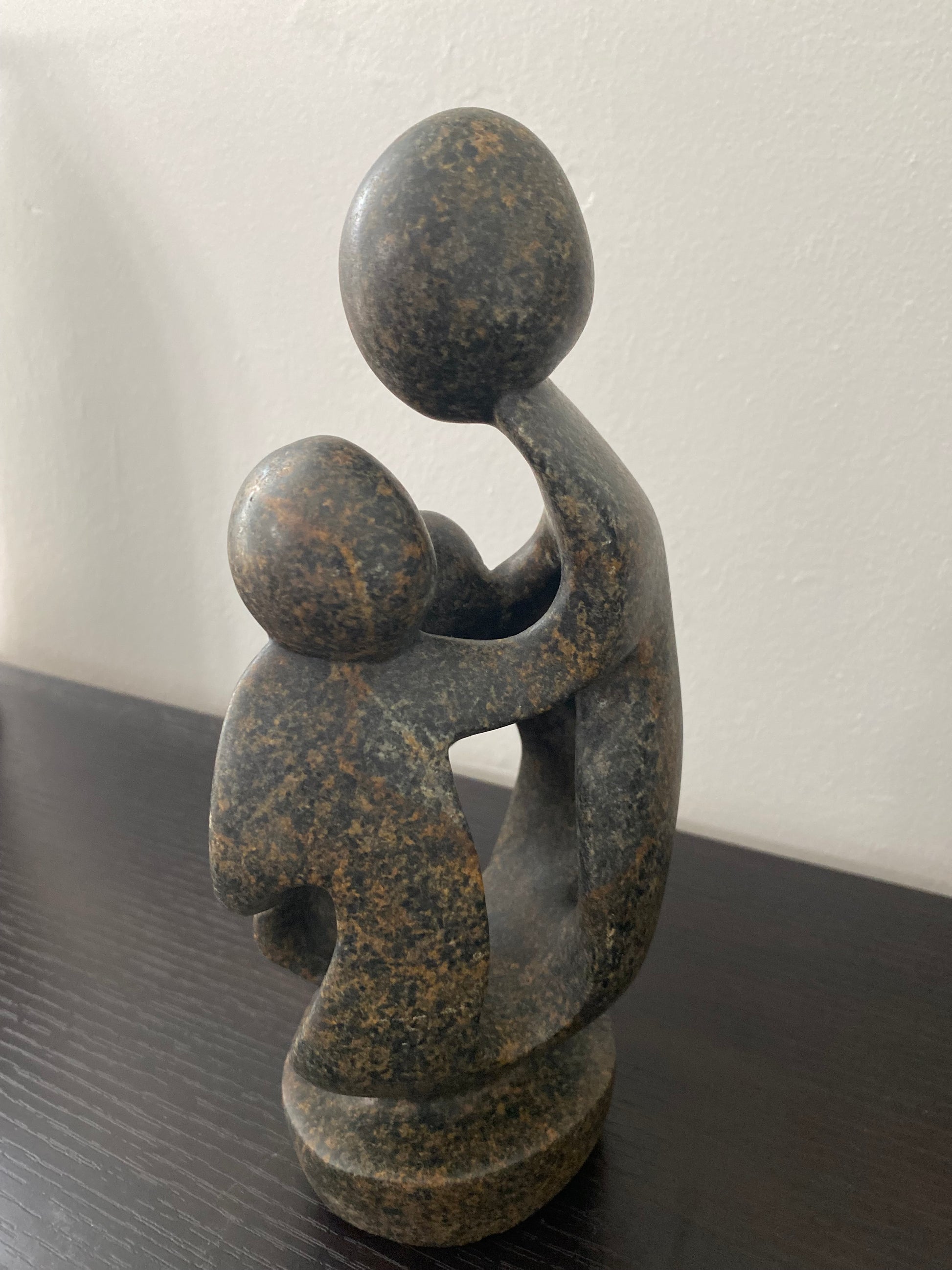 ”Ukama” is the Shona word for “close family relationship”. Central to Shona culture is the support and success of the family. Success is not measure by material wealth, but by the accomplishment of creating a loving and supportive family environment full of health and happiness. This family sculpture portrays the bond of support between parent and their child. The arms are united to shield them from outside adversity while at the same time enabling them to express their love and closeness to each other.