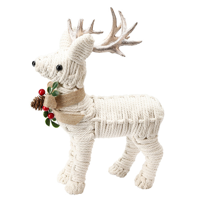 Weaved Rope Covered Standing Reindeer with Champagne Antlers & Bow – 33cm, Ivory