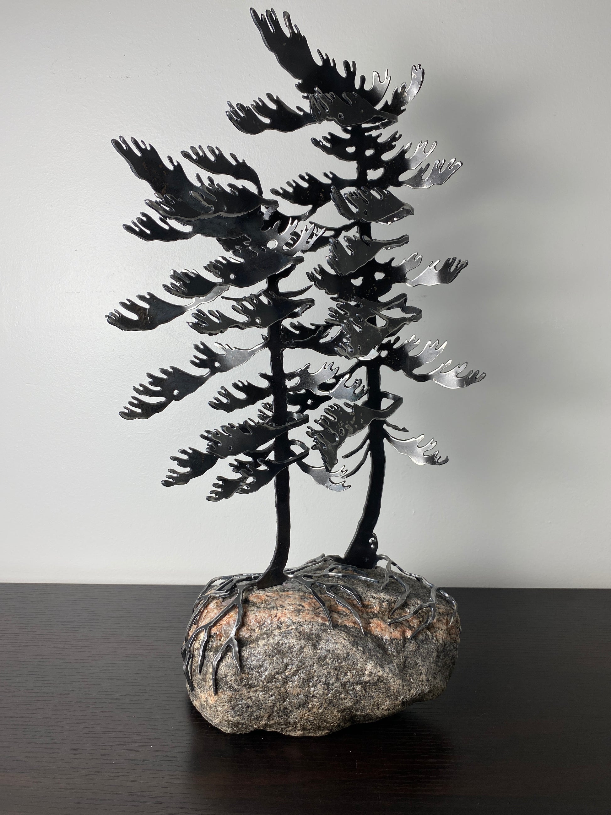 The tree is hand-cut from steel, shaped to echo the rugged silhouettes found along the Canadian Shield. It stands securely on a genuine piece of granite, giving the sculpture a grounded, organic presence that feels both modern and timeless. Because every stone and every cut is unique, each piece has its own personality — no two are ever alike.