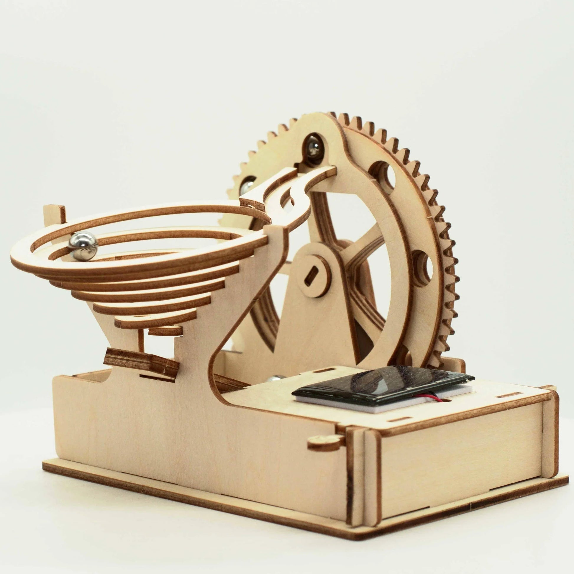 This Wooden Marble Run kit is a perfect gift for ages 8 and up, making it an ideal desk toy. The kit includes easy-to-remove die-cut wooden pieces that require about an hour to assemble, offering a fun opportunity for collaboration. As a STEM toy, it teaches valuable concepts in science, technology, engineering, and math while providing an engaging, hands-on learning experience. The marble run can be powered by either solar or battery power, with strong sunlight needed for solar operation to cycle the ball back to the start for continuous play. The kit comes complete with all parts and detailed assembly instructions.
